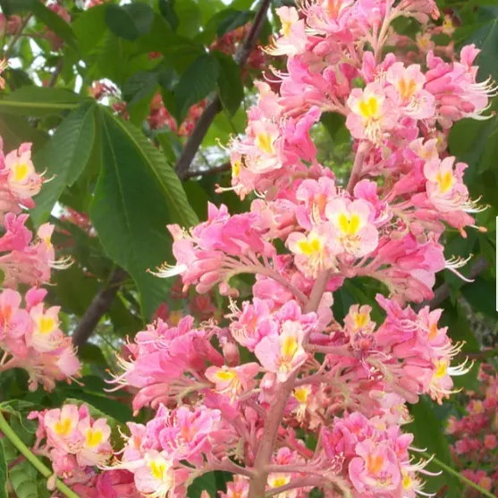 Cone-shaped light pink flower spikes in late spring, large and dramatic! Seedless and fruitless – no mess!